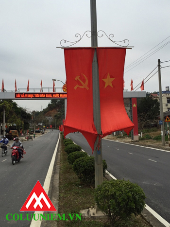 cờ nheo treo ở cột điện, có in hình búa liềm, và cờ tổ quốc