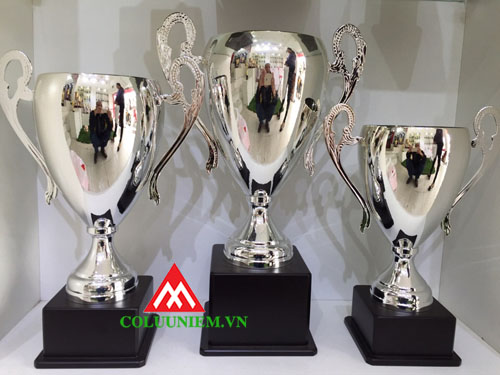 Bề mặt cúp nhẵn sáng bóng nổi bật trên nền gỗ MDF đen, hai bên thân có hai quai hình cá ngựa vẫy đuôi làm tôn vẻ đẹp cúp.
