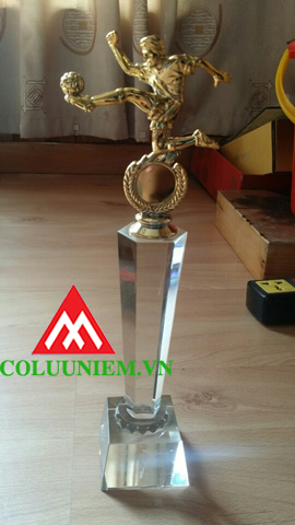 Cúp thủy tinh hình người sút bóng ấn tượng, đẹp mắt, dưới là hình nguyệt quế vinh quang