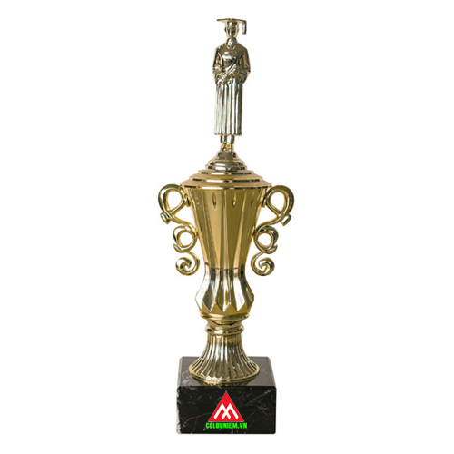 Cúp vinh danh mạ vàng độc đáo. Sản phẩm được thiết kế theo hình dáng cúp cao, có sự bo xéo sành điệu ở phần thân làm cho chiếc cúp trở nên quý phái hơn. Hai quai được trang trí kiểu xoắn ốc đẹp mắt. Phần đỉnh cúp là chân dung mô phỏng cử nhân tốt nghiệp. Sản phẩm là món quà ý nghĩa, thích hợp để tôn vinh, lưu niệm trong các buổi lễ tốt nghiệp dành cho các học sinh, sinh viên ra trường.