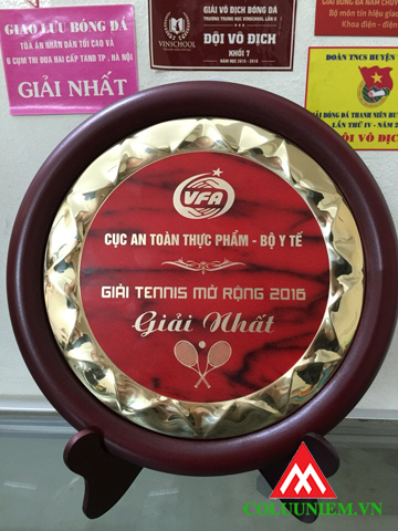 Đĩa kỷ niệm gỗ nâu tròn, vành gỗ chạy vòng quanh miếng kim loại màu đỏ, độc đáo, đặc biết, rất hiếm thấy, dùng trong mọi sự kiện, tôn vinh văn hóa, nghệ thuật