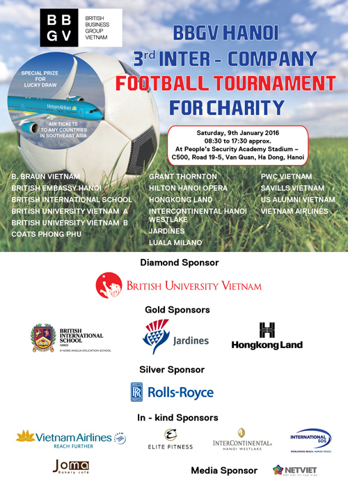 BBGV Hà Nội lần thứ 3 của Inter-Company Football Tournament sẽ diễn ra vào thứ Bảy Tháng Một 9, năm 2016. Giải đấu này, bao gồm 16 đội, hứa hẹn sẽ mang lại sự phấn khích, những kỷ niệm và rất nhiều niềm vui! Đồng nghiệp và gia đình được nồng nhiệt chào đón để hỗ trợ và cổ vũ cho đội bóng của họ. Quan trọng hơn, giải đấu này sẽ gây quỹ cho dự án từ thiện đã đăng ký trên toàn Việt Nam.