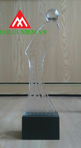 Cúp hình người cách điệu cầm gậy golf, pha lê tinh xảo, quả bóng golf nhỏ đặt tinh tế trên đầu cúp, đế cúp đá đen sang trọng, vững chắc. Thân cúp có những vân cách điệu điệu đà