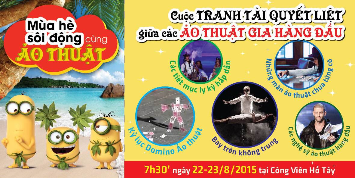 Những màn ảo thuật vô cùng đặc sắc, những phép biến hóa tựa như ma thuật, chưa từng có sẽ được tổ chức trong chương trình “NHỮNG CUỘC TRANH TÀI QUYẾT LIỆT GIỮA CÁC ẢO THUẬT GIA HÀNG ĐẦU tại Công viên Hồ Tây vào 19h tối ngày 22 và 23 tháng 8 năm 2015. Ảo thuật, một bộ môn được thế giới công nhận là bộ môn nghệ thuật thứ 8 của nhân loại với những màn biểu diễn sáng tạo, bất ngờ và lôi cuốn sẽ được xuất hiện trong chương trình nhằm mang đến cho người xem một trải nghiệm nghệ thuật mới. Chương trình là một sân chơi bổ ích với những nghệ sĩ ảo thuật gia hàng đầu như: Tuấn Phương, Quang Tuấn, Lê Bình cùng các thí sinh dự thi đã vượt qua 2 vòng sơ tuyển của chương trình Đại hội Ảo thuật The Magic Secret 2015 đã diễn ra từ đầu năm 2015.
