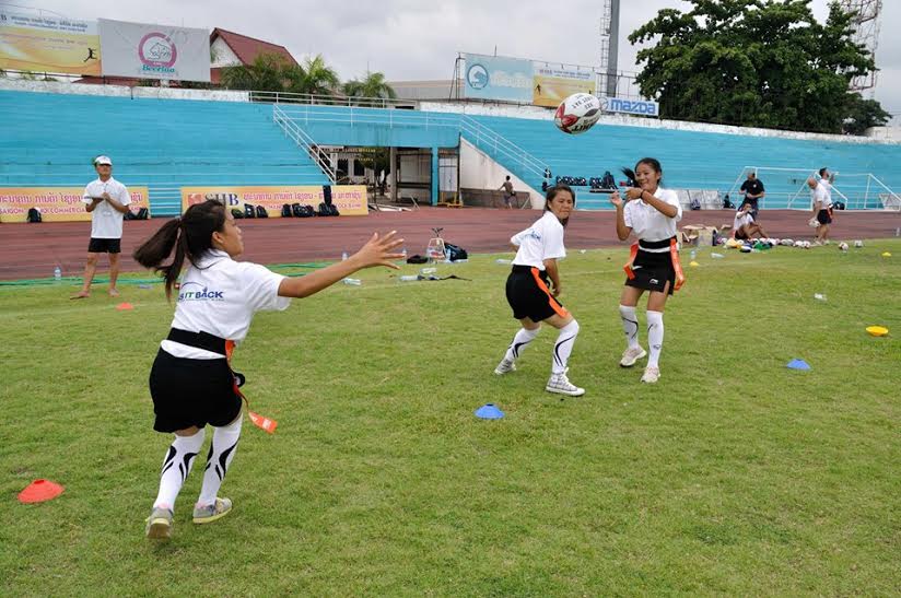 Các huấn luyện viên dự án ”Pass it Back” luyện tập bóng bầu dục tại Lào